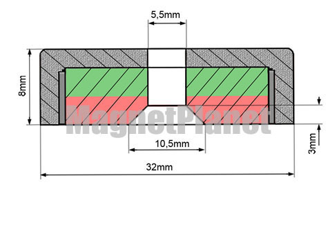 32x8 mm-es NEODYM POT mágnes, rögzítő mágnes, süllyesztett, 5,5 mm-es lyukkal, cink bevonattal.